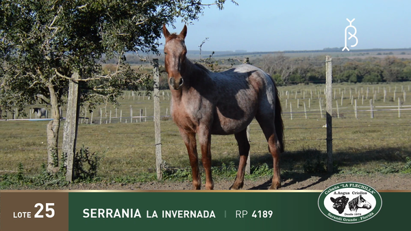 Yegua domada, que ha producido muy lindas crías en la Cabaña, es hija del famoso Halcón La Invernada RP 2465 – RM 101 Gran Campeón Melo 1977 y mejores aplomos, con otra notable producción de ganadores de marcha como (26 hijos participaron en Marchas logrando 13 primeros puestos, 4 segundos puestos y 5 terceros): “Mosqueta” RP 3212, “Leyenda” RP 3113, “Armonia” RP 3362, “Balconada” RP 3548, “Azucena” RP 3781, “Malicia” RP 3682, “Mirada” RP 3737 (Res. Gran Campeona Melo 2000), “Magnolia” RP 3901, “Malva” RP 3945, y “Chubasco” RP 2870; y de segundos y terceros puestos como “Anahi”, “Cuita”, “Comarqueña”, “Milonga”, “Canoa”, “Mulita”, “Monedita”, y “Bohemia La Invernada”. Entre los hijos machos de “Halcón” se destacan “Pulpero”, “Jabalí”, “Yucatán”, “Resorte”, “Lancero La Invernada” RP 3148 y “Boliche La Invernada” RP 3767. Si es de interés del comprador, la Cabaña ofrece el servicio opcional de Encargado LI o Tiento Talibán y después del mismo se entrega la yegua.